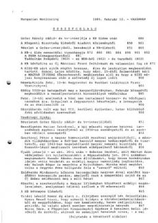 A moszkvai rádió jelentése szerint az Afganisztánból kivonuló szovjet csapatkontingens utolsó motorizált egysége is áthaladt már a Szalang-hágón. – A łódź-i nagyáruházban befejeződik a sztrájk, másik három lengyelországi munkahelyen azonban szombaton is tart bérkövetelő munkabeszüntetés. – A lengyel kerekasztal-tárgyalások részeként működő, a jogi rendszer reformjával foglalkozó bizottság kezdi meg munkáját.