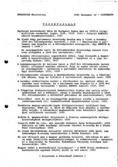 Az Országgyűlés terv- és költségvetési bizottsága elfogadja az 1990. évi költségvetés tervezetét, de a lakásgazdálkodásról szóló koncepciót (miként már több parlamenti bizottság) elutasítja. – Budapest és Bécs megkapja az 1995-ös világkiállítás megrendezésének jogát. – A Hazafias Népfront Országos tanácsa úgy dönt, hogy a szervezet minden körzetben jelöltet állít a választásokon. A mozgalom egyúttal választási szövetséget hoz létre Hazafias Választási Koalíció néven.