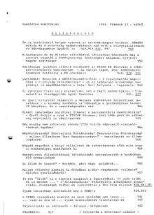 Az Elnöki Tanács döntései: Magyarország csatlakozzon a genfi menekültügyi egyezményhez, szakítsák félbe a katonai szolgálatot megtagadó 70 elítélt börtönbüntetését.– Németh Miklós kormányfő a termelőszövetkezetek rendkívüli konferenciáján újból elutasítja a Magyar Demokrata Fórum javaslatát az új földosztásról. – A Világbank 140 millió USD-s kölcsönt ad Magyarországnak az ipari szerkezetátalakítási program finanszírozására. – A Független Kisgazda Párt Politikai Bizottsága kizár négy vezetőt a pártból bomlasztó tevékenység miatt.